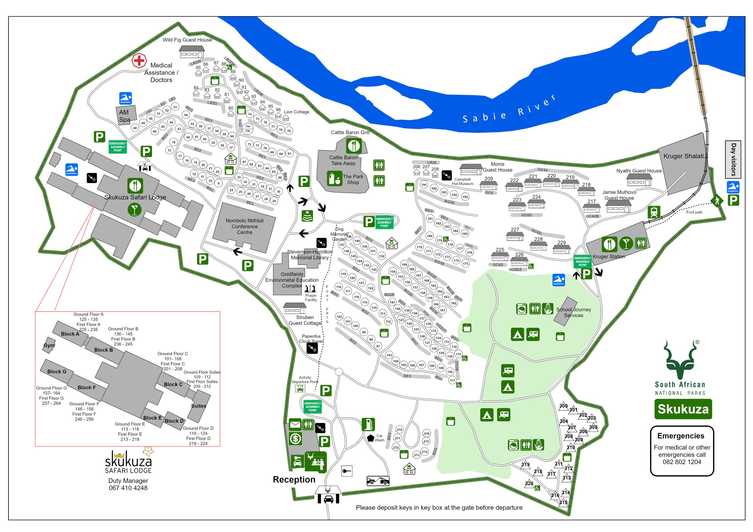 • Skukuza est le camp le plus fréquenté du parc. L’animation constante, le passage des voitures et la présence de nombreux voyageurs peuvent donner l’impression d’être dans une petite ville.