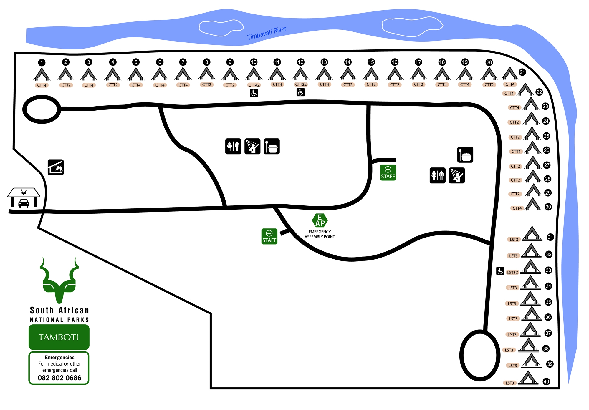 Tamboti se trouve à environ 4 km d’Orpen Gate, ce qui en fait l’un des camps les plus faciles d’accès du Kruger. Depuis l’entrée, il suffit de suivre une courte route pour rejoindre Orpen Rest Camp, où se font les formalités d’enregistrement, puis quelques minutes supplémentaires pour atteindre Tamboti.
