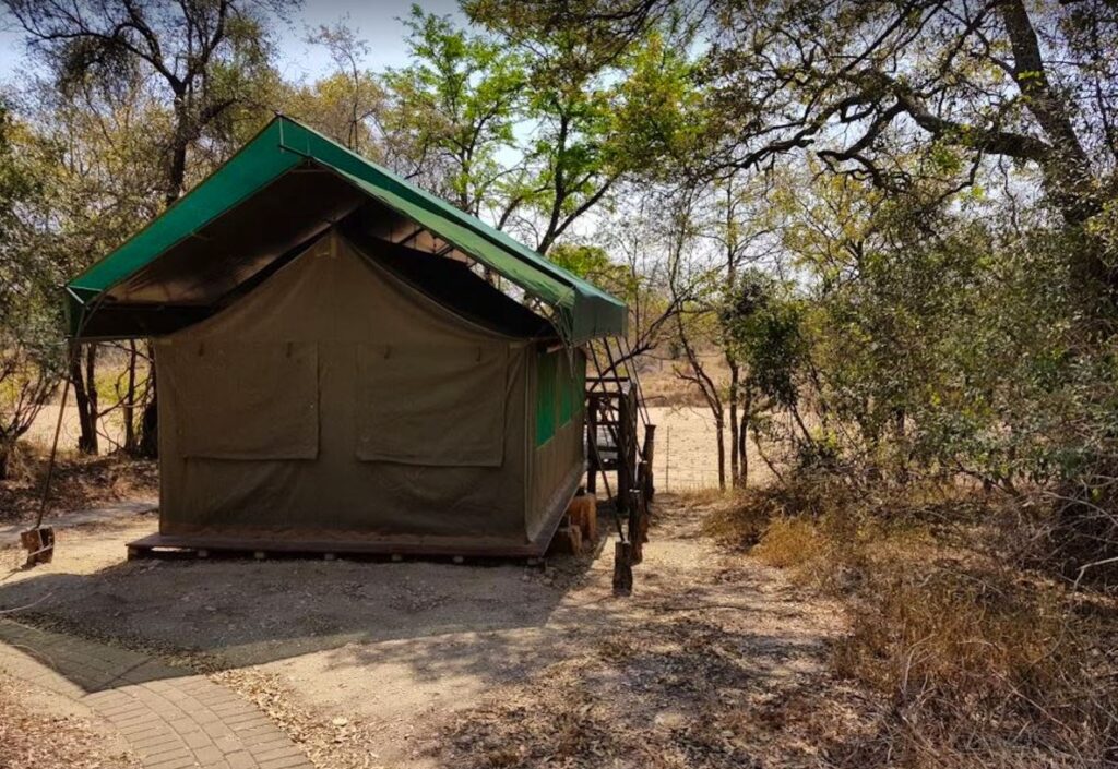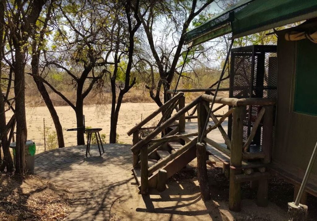 • Le camp dispose néanmoins de tout le nécessaire pour un séjour agréable : chaque tente est équipée d’une petite terrasse en bois, de lits, d’une kitchenette de base et d’un braai pour cuisiner en extérieur. Certaines tentes plus confortables offrent en plus salle de bain privée et climatisation, tandis que les versions plus simples partagent des sanitaires communs.