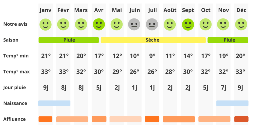 L’affluence est moindre en dehors des fêtes de fin d’année, et les prix des hébergements peuvent être un peu plus doux. Il faut prévoir l’essentiel : répulsif anti-moustiques, traitement préventif contre le paludisme, et une bonne dose de flexibilité. Les pistes peuvent être boueuses et certaines routes temporairement plus difficiles.